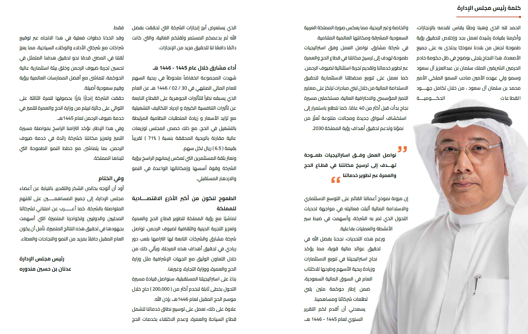 حققت مشارق خلال عام 1445 – 1446 هـ تقدماً كبيراً في مسيرتها نحو النمو والازدهار بفضل الله ثم بجهود فريقها المخلص. إن شركة مشارق تركز على الحفاظ على مكانتها في قطاع خدمات الحج، حيث ما زالت تتمتع بحصة سوقية كبيرة. وخلال العام المالي المنتهي في 30 / 02 / 1446هـ، حققت الشركة إجمالي إيرادات بلغ نحو ( 963 ) مليون ريال، مع هامش مجمل ربح عند ( 33.5% ) وهامش إجمالي دخل شامل عند ( 20.7% ). وجاء هذا النجاح نتيجة التعاون الوثيق مع شركائنا من مكاتب شؤون الحجاج في الدول التي تشرفنا بخدمتها، وتوج بحصولنا على جائزة لبيتم للتميز في خدمة ضيوف الرحمن لعام 1445هـ، من وزارة الحج والعمرة. نأمل أن تستمر مسيرتنا نحو التميز عاماً بعد عام، ونحن نمضي بثقة نحو مستقبل يرتكز على العطاء والنمو والازدهار، وفق خطط طموحة تهدف إلى تنويع الاستثمارات وتوسيع الشراكات محلياً ودولياً.