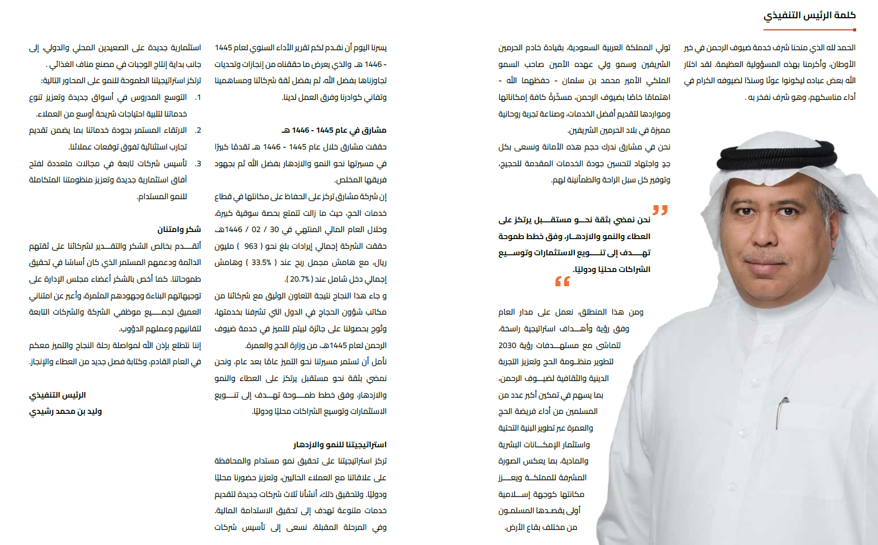 يسرنا اليوم أن نقدم لكم تقرير الأداء السنوي لعام 1445 – 1446 هـ ، والذي يعرض ما حققناه من إنجازات وتحديات تجاوزناها بفضل الله، ثم بفضل ثقة شركائنا ومساهمينا وتفاني كوادرنا وفرق العمل لدينا.